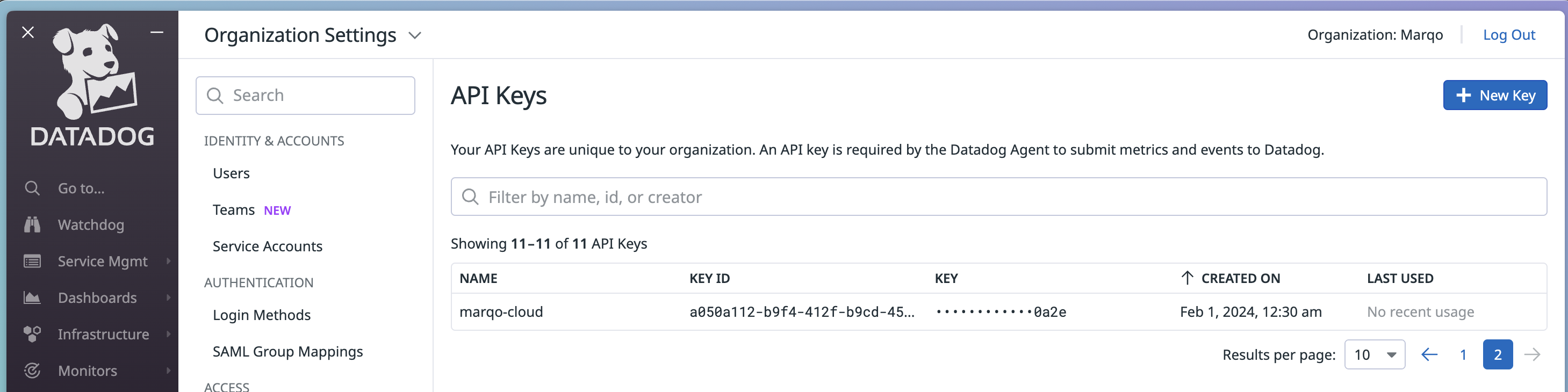 You will need a Datadog API key to set up your Marqo Cloud to Datadog integration. To generate the API key from your Datadog account, navigate toProfile > Organization settings > API Keys and click on New Key or copy one of the existing keys. These API Keys only allow Marqo Cloud to push metrics to your datadog account, but doesn’t allow Marqo Cloud to access or read any data from your Datadog account.