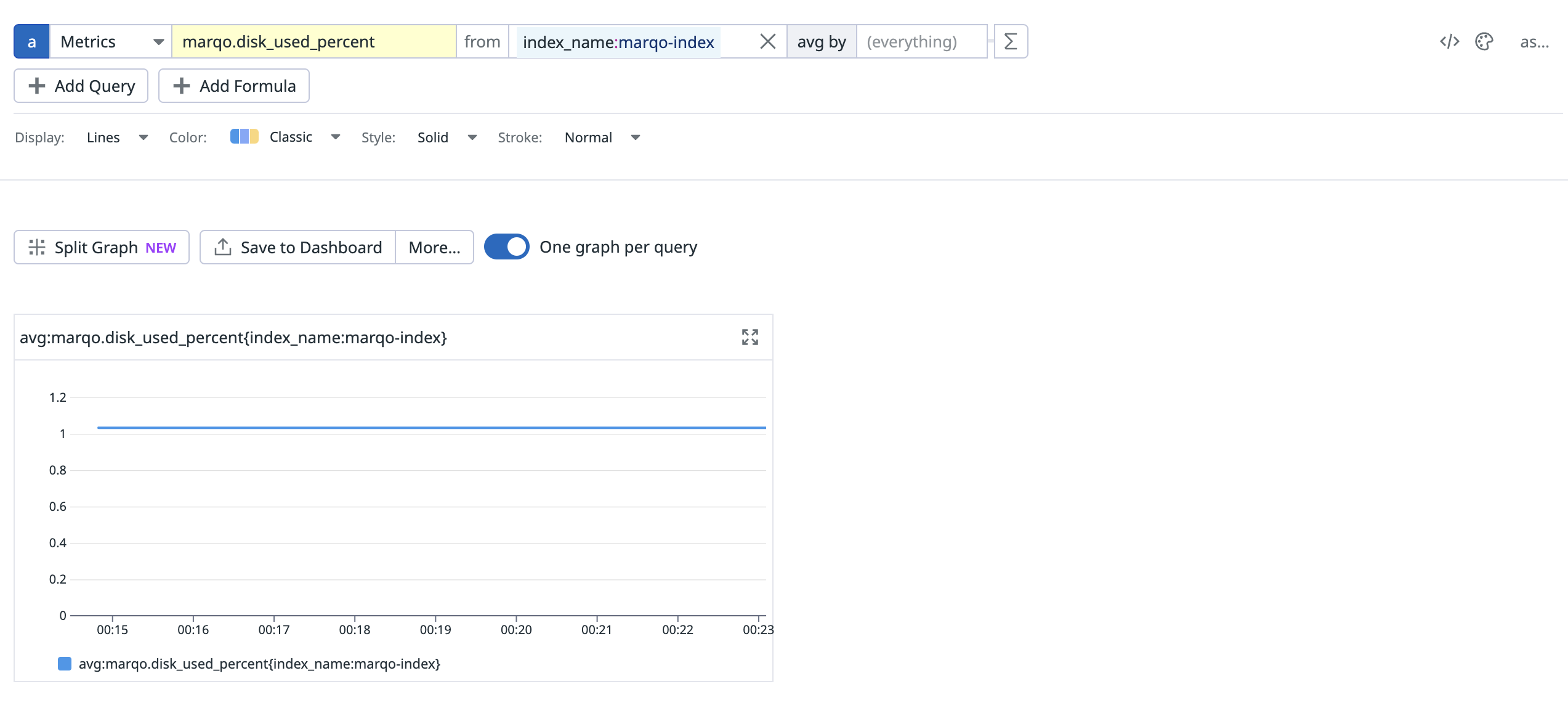 Every index is provisioned with a fixed disk size based on the number of shards and type of storage shard you configure. This metric tells you the amount of disk used in percentage. You can aim to keep this number below 70% for optimal performance. A new datapoint is published once every 30 seconds. Metric Name:marqo.disk_used_percentage