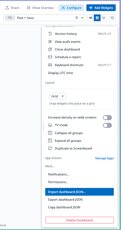 Once your dashboard is created and opened. Click on the Configure button on the dashboard on the top right corner and then select Import dashboard JSON from the menu. Once the pop-up dialog is open, paste the JSON that you copied from the link above.