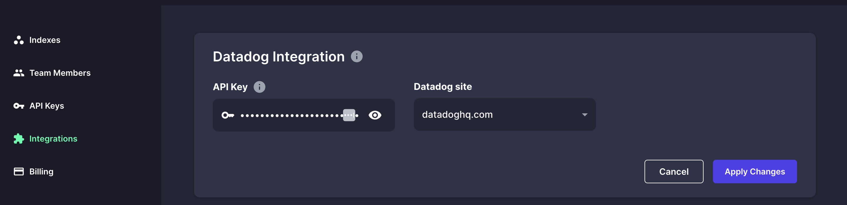 Datadog has multiple sites. To set up an integration between Marqo Cloud and Datadog you need to find your datadog site. You can find this information from your datadog website url. For instance if your datadog website url is https://app.datadoghq.com then in Marqo console you should select datadog site datadoghq.com when setting up your integration. You can read more about datadog sites and find the mapping between webite url and datadog site here.API Key