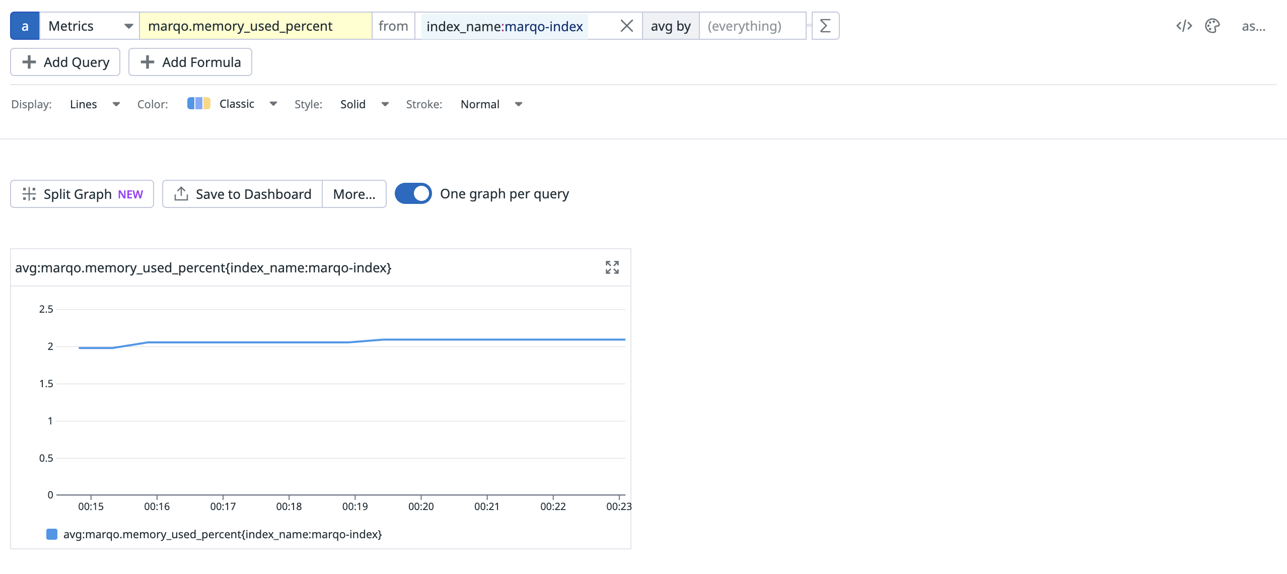 Every index is provisioned with a fixed amount of memory based on the number of shards and type of storage shard you configure. This metric tells you the amount of memory used in percentage. You can aim to keep this number below 70% for optimal performance. A new datapoint is published once every 30 seconds. Metric Name:marqo.memory_used_percentage
