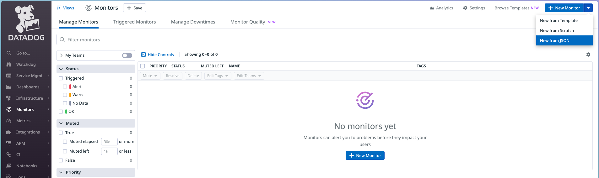 We recommend that you setup atleast the following 2 Monitors by copying the JSON configurations listed below and importing it into your account by clicking on New from JSON on the top right corner of the screen and paste the copied JSON from below and save.