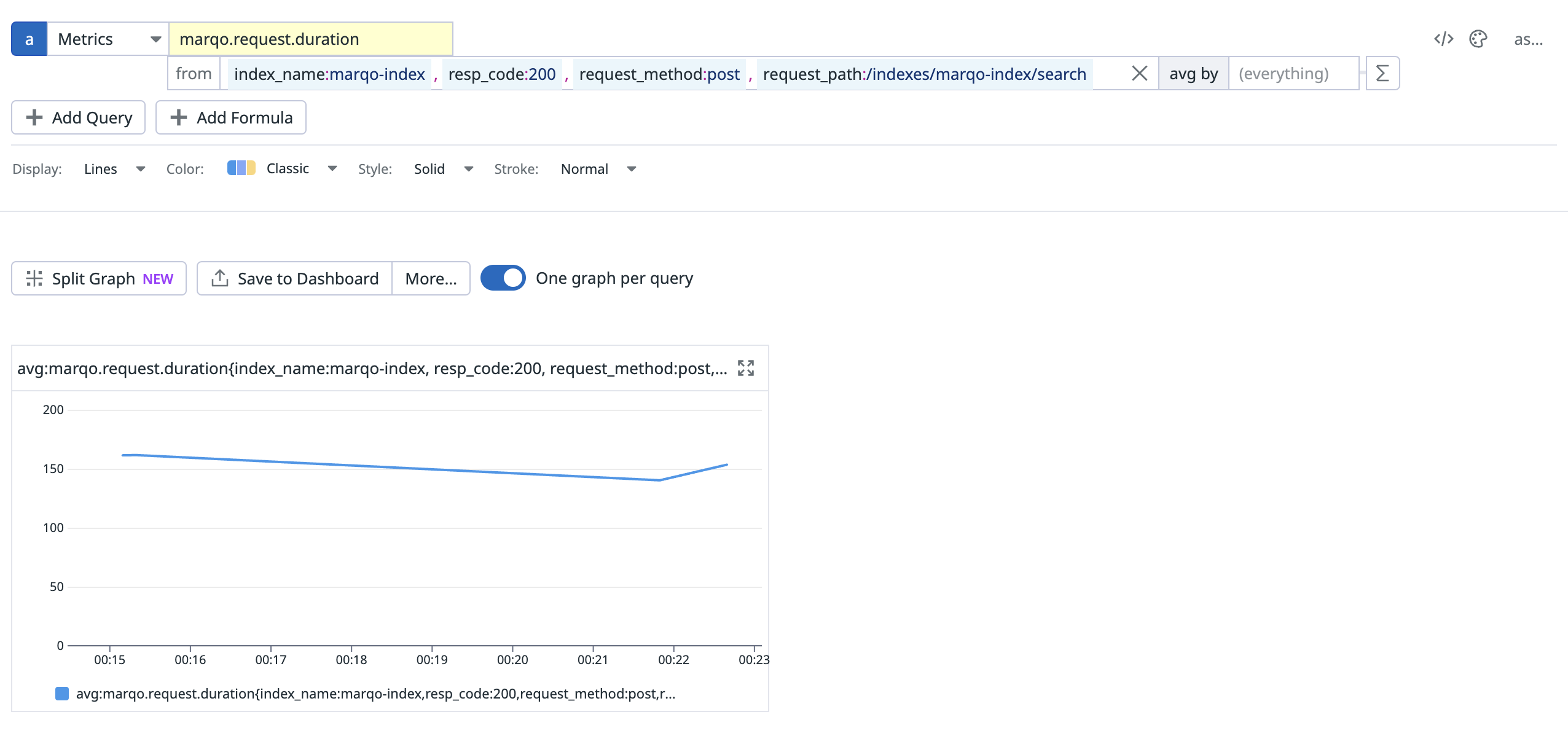 To monitor average duration for all search requests with 200 response code against index A:avg:marqo.request.duration{index_name:A,request_path:indexes/A/search,resp_code:200,request_method:post}