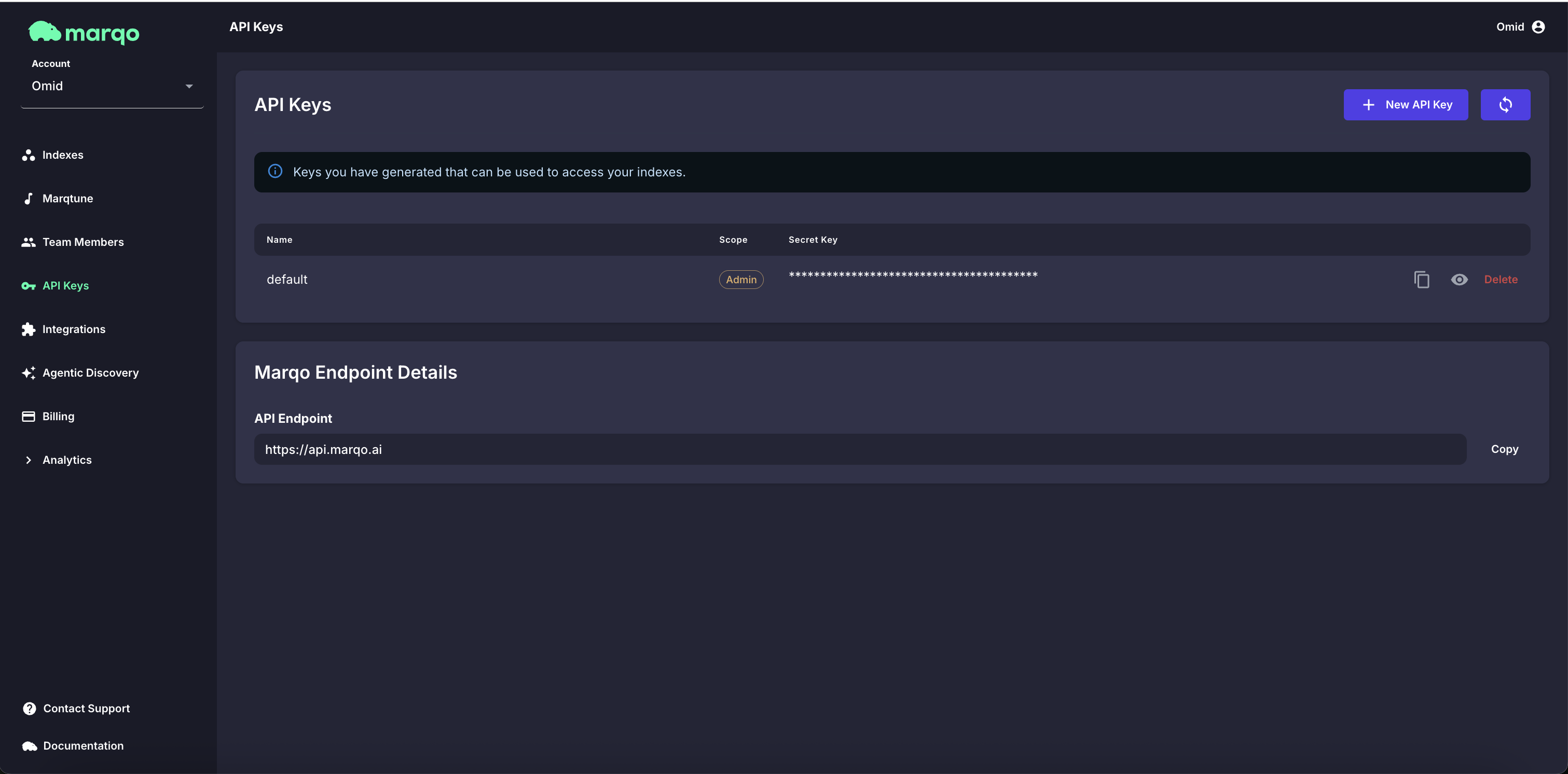 If you don’t yet see the scope options (Admin, Read-Write, Read) in your Marqo Cloud account, please contact support and we’ll enable them for you.