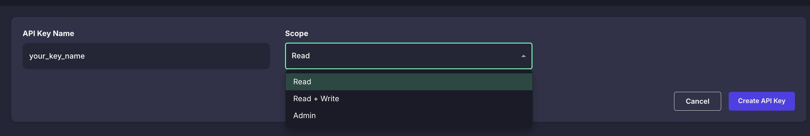 Note: Scoped API keys are being rolled out gradually.If you decide you want to create a new API key, you can do as follows.