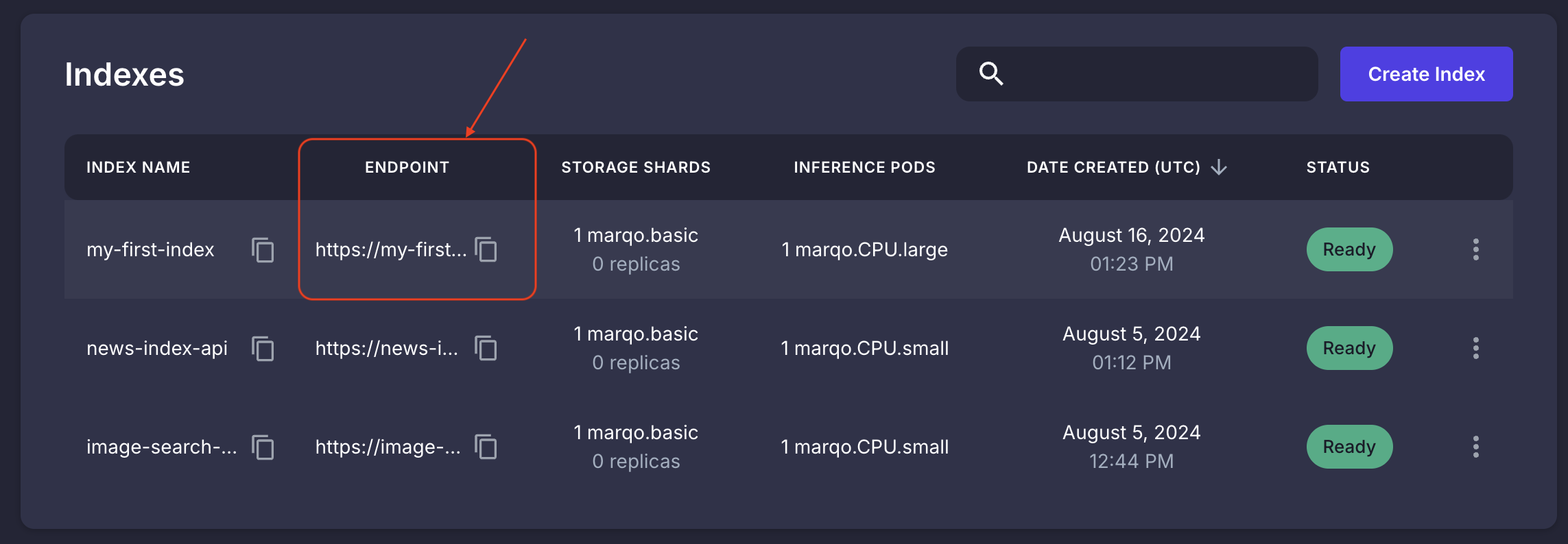 Notice in the second column, there’s an option for ‘endpoint’. Click on the copy icon next to the endpoint. You can then use to search, index and perform other operations on your Marqo index.